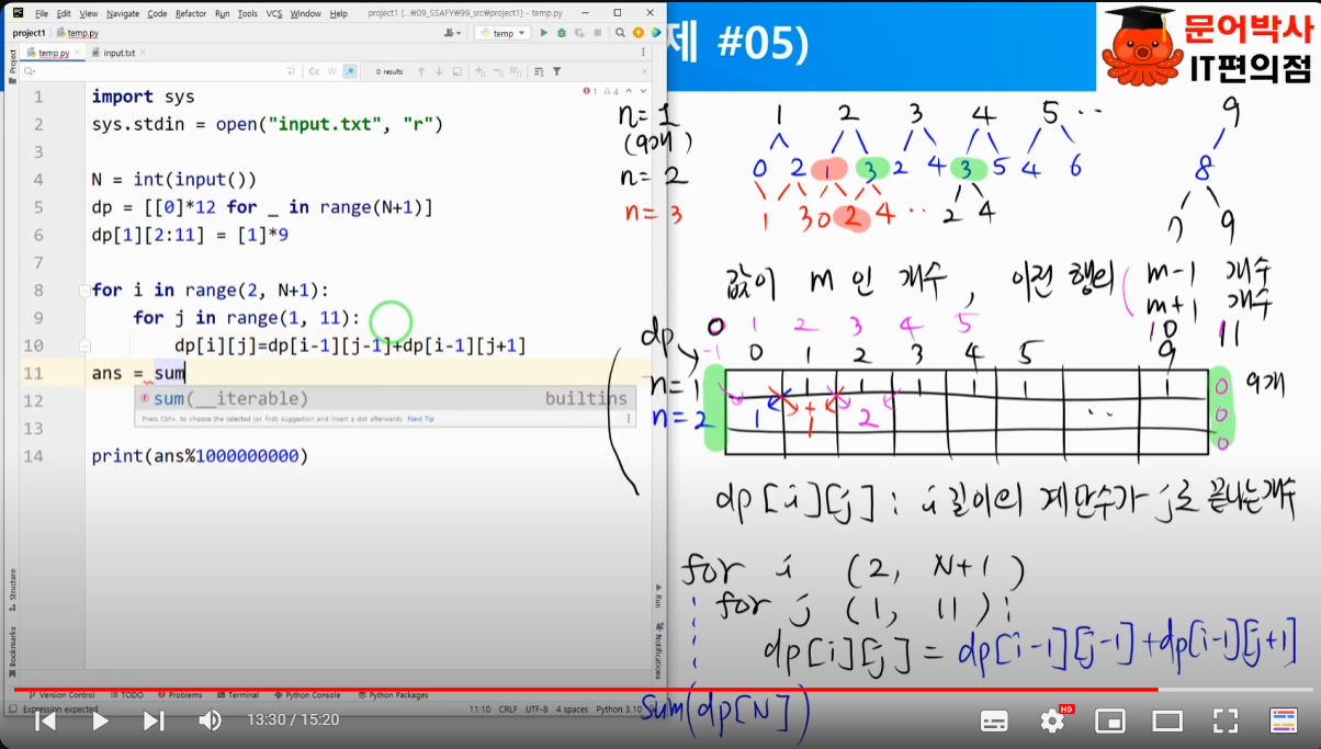 1. 규칙발견 && 테이블정의 : dp [길이][끝나는숫자] 의 갯수