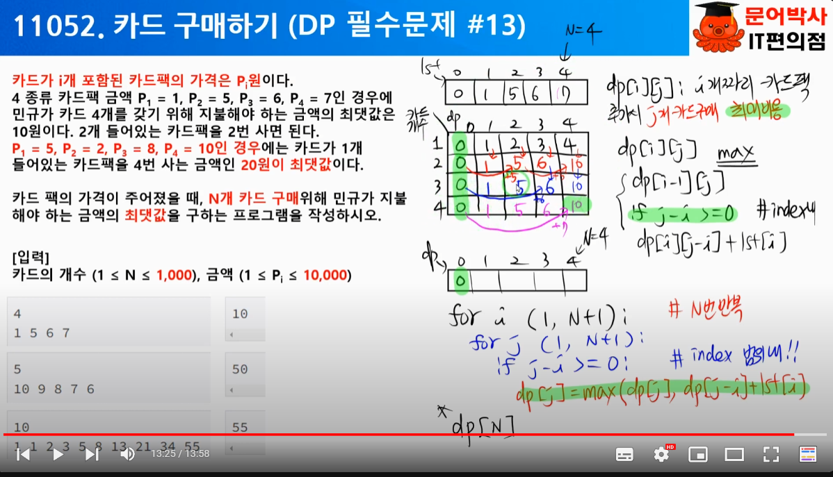 d[j-i] + arr[i]( j-i개 카드를 추가하기 위해 이번에 추가된 주머니 사용하는경우)를 비교해야함을 알아낸다.