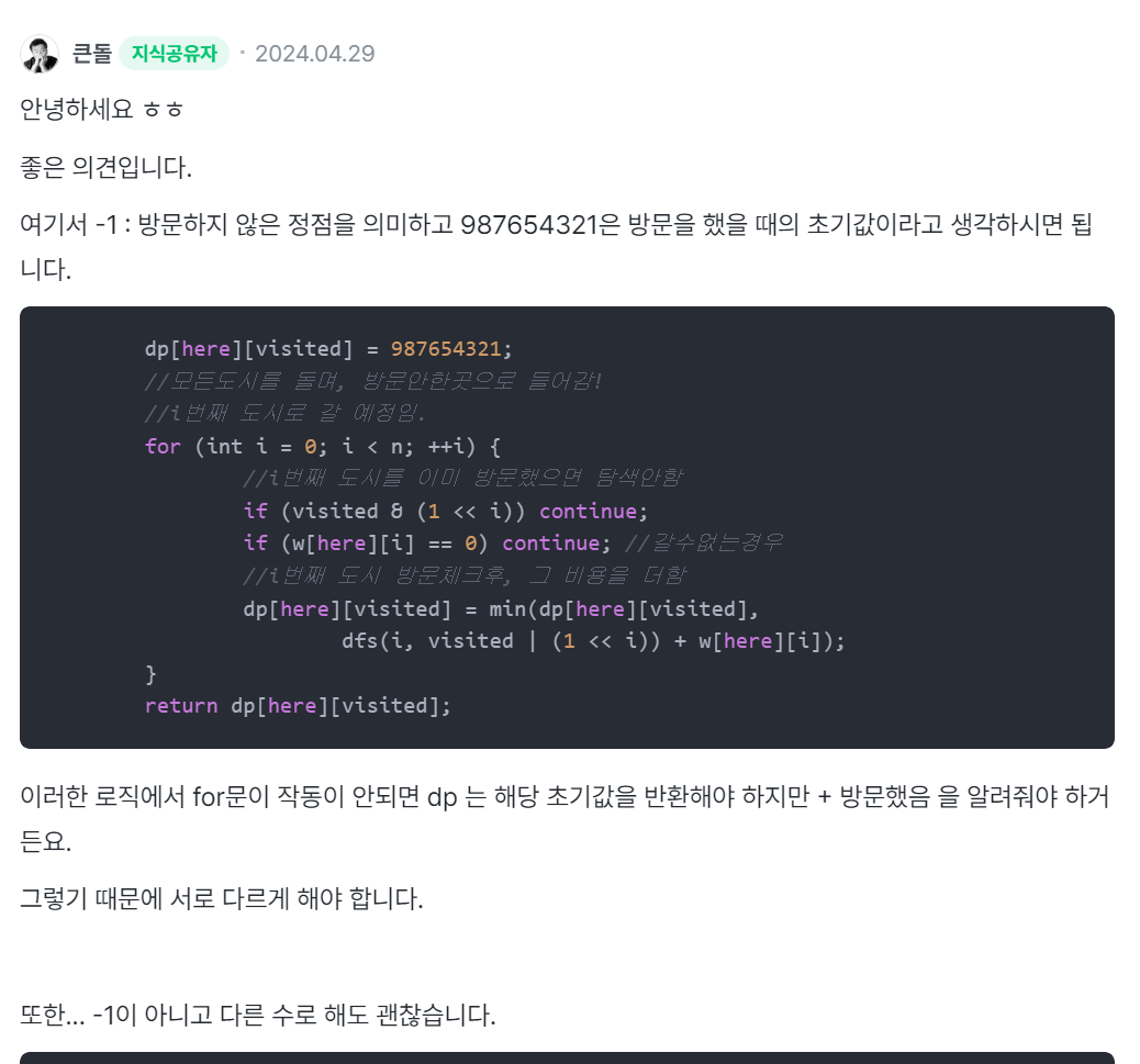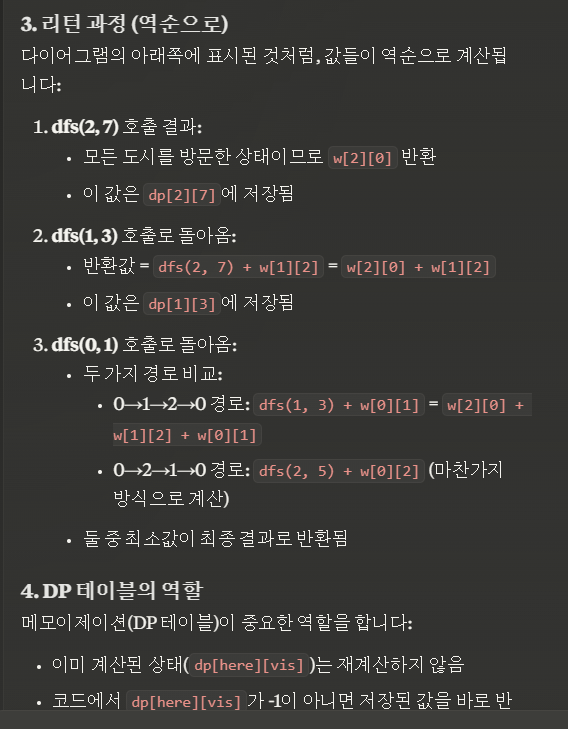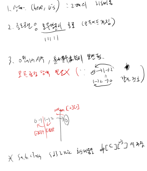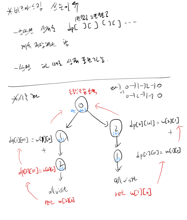 4.2 dp = min( dp, dfs(i, i도시 비트추가) + i도시로 가는비용)