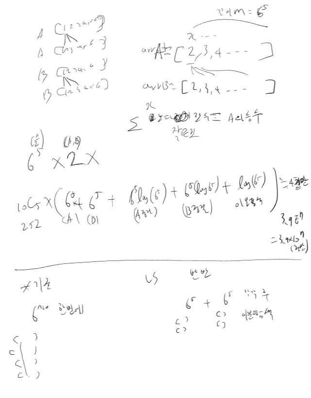 복잡도 : //dp : a따로( 10C5 * 6^5 ==1,959,552), b따로계산(1,959,552) / 이후 정렬후 이분탐색 6^5 lg 6^5+ lg 6^5