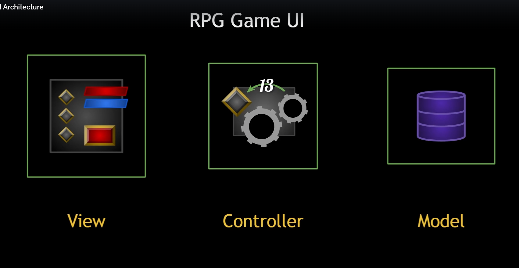 뷰, 모델(데이터, 마나, 레벨 등), 위젯컨트롤러(모델에서 데이터 검색후 뷰에 전달)