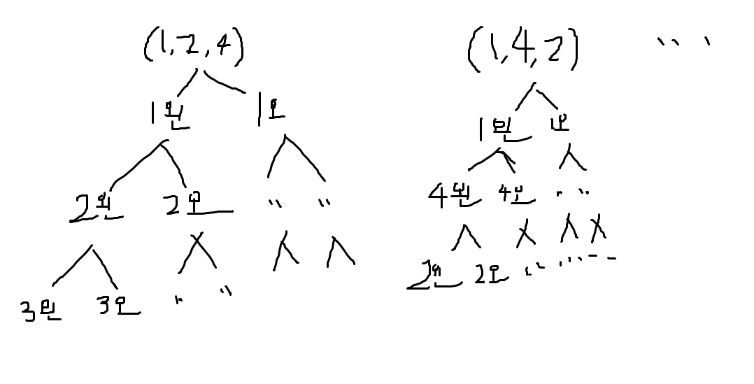 3.dfs : (1,2,4)에 대해 왼쪽,오른쪽 분기로 dfs2개 돌린다.