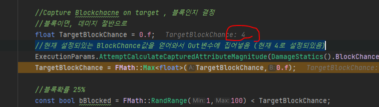 //현재 설정되있는 BlockChance값을 얻어와서 Out변수에 집어넣음 (현재 4로 설정되있음)