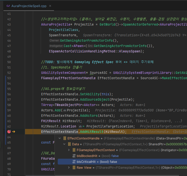 3. 결과확인 : 불덩이발사후, EffectContextHandle에 내가 추가한 속성2개가 들어간것을 확인할수 있음.