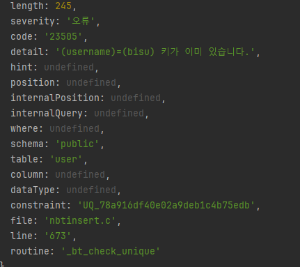 에러코드 23505 == already key error 코드임 -> 메시지 찍어주면 되겠다.