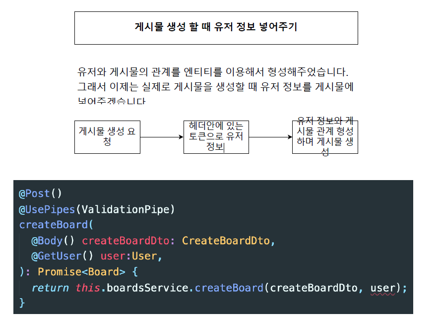 [Nest JS] 유저-게시글의 관계 형성, 게시글 생성시 유저정보 추가 본문