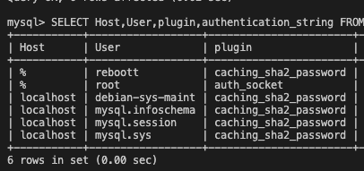 SELECT Host,User,plugin,authentication_string FROM mysql.user;