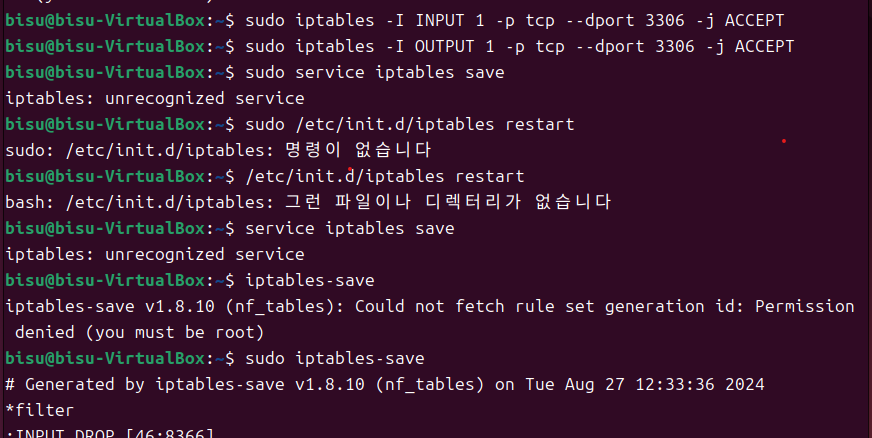 * 해결 : accept 후 iptables-save로 저장함.