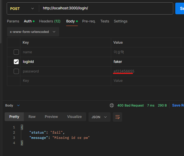 - 목표 : 로그인전에 req에 id, pw가 있는지 확인하고싶다.