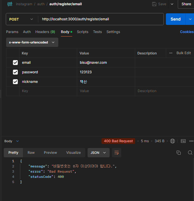 throw new BadRequestException('비밀번호는 8자 이상이어야 합니다.');