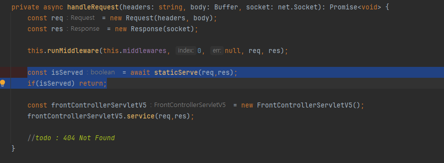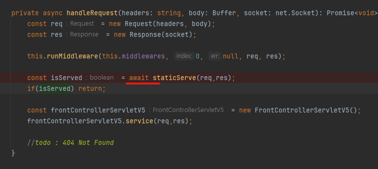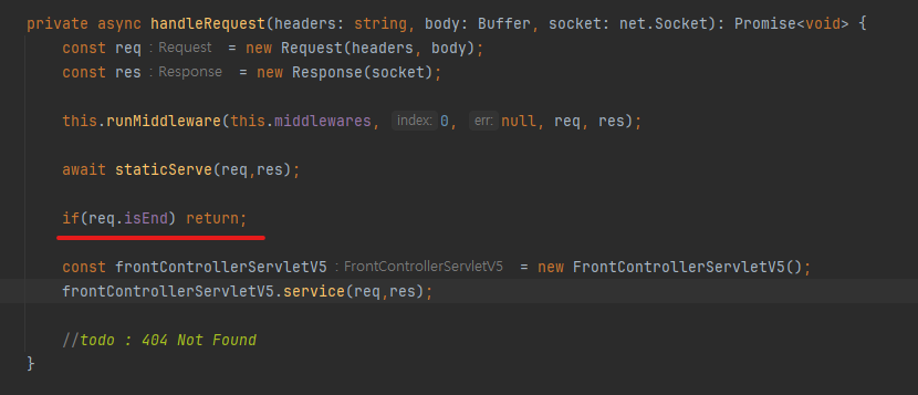 - 문제는 앞으로 미들웨어를 추가할때마다 (ex : 세션검사, 권한검사 등) handleRequest 코드에 if ( session ) return 등을 추가해야된다는 점이다.