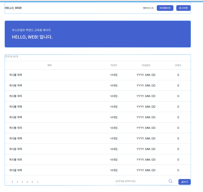 - 로그인 된경우, 회원 닉네임, 멤버리스트, 마이페이지, 로그아웃, 검색어, 글쓰기 를 보여준다.