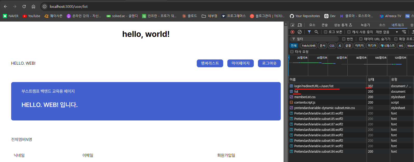- 버그 : user/list를 그대로 요청 -> model에 member가 없음 -> ejs 에러