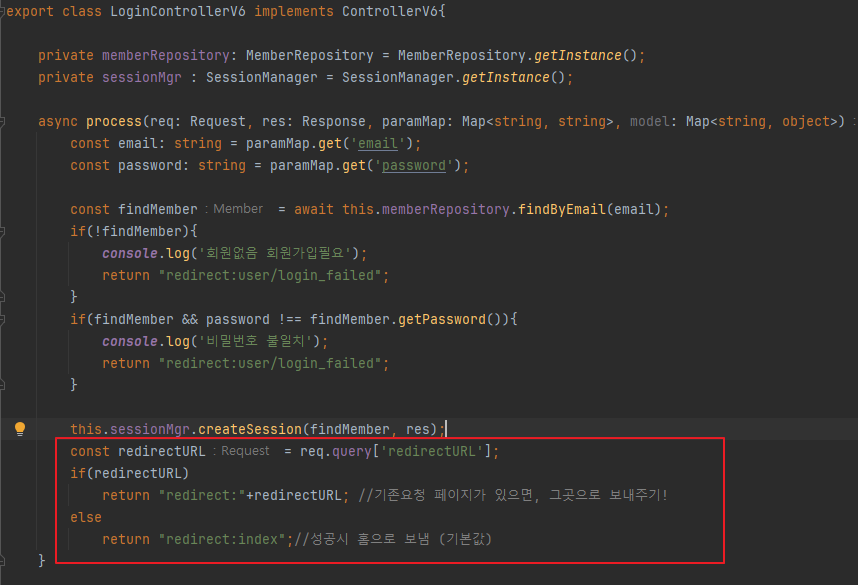 - login 요청을 처리하는 컨트롤러에서도 redirect 쿼리 파라미터가 있는지에 따라 분기한다.