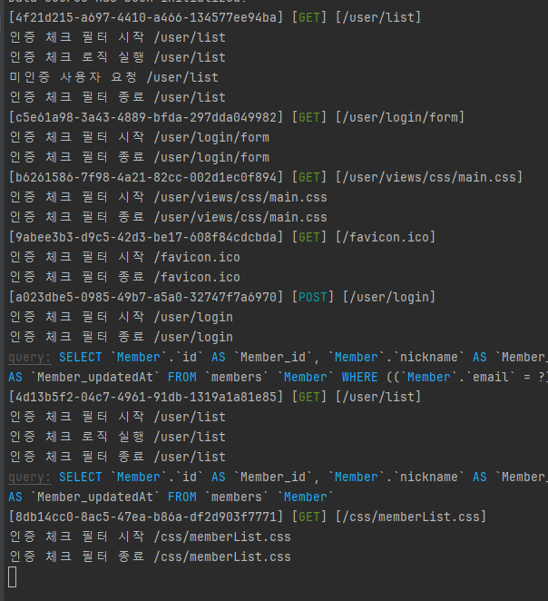 - 미인증사용자이므로 user/login/form?redicrtURL=user/list로 재요청 (AuthFilter)