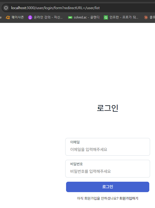 - 사용자가 아이디, 비번 입력후 로그인 버튼 누르면 /user/login?redirectURL=user/list로 재요청 (ejs form)