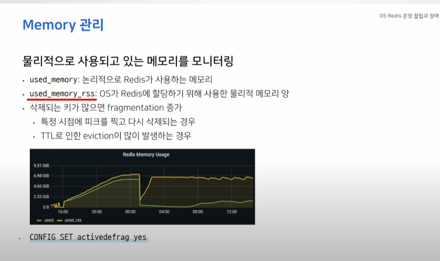 - 삭제작업이 많을때 frag가 증가할수있다. // 삭제작업을 위해 os가 redis에 메모리할당, but 삭제로 간주 -> 논리적 메모리 사용량은 감소
