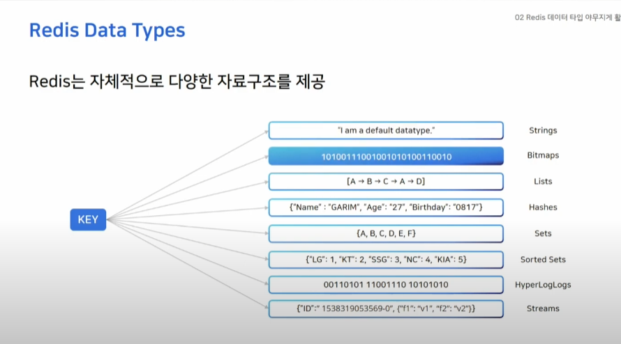 Redis (Remote Dictionary Server) Redis는 Remote(원격)에 위치하고 프로세스로 존재하는 In-Memory 기반의 Dictionary(key-value) 구조 데이터 관리 Server 시스템이다. 여기서 key-value 구조 데이터란, mysql 같은 관계형