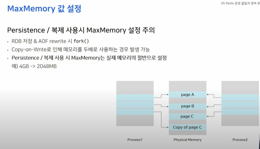 - 레디스에서 데이터를 파일로 저장하고자 할 때 Copy-On-Write라는 기능을 사용합니다. 이 기능을 이용해야 백그라운드에서 파일로 데이터를 저장하는 동시에, 레디스에 연결된 기존 어플리케이션의 커넥션도 이슈 없이 대응할 수 있기 때문입니다. 이 Copy-On-Wrtie는 물리적으로 기존의 메모리를 복사해서 사용하기 때문에, 경우에 따라 레디스가 사용하는 총 메모리가 (maxmemory * 2)가 되는 상황이 발생할 수 있습니다.