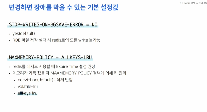 - write 불가능 옵션을 꺼두자. 장애가능성이 있다. (Redis Server 모니터링은 필요!)