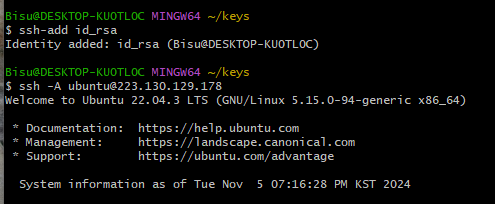 - 해결 : ssh-add 명령어 => 내 비서에게 key를 맡기고 같이 들어가기!