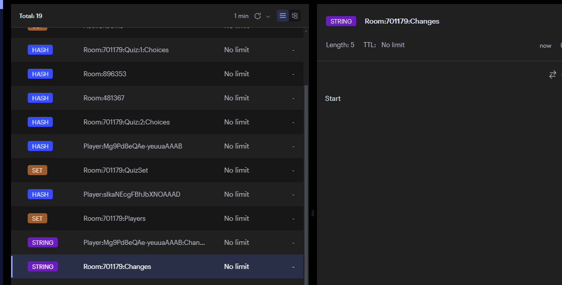 * HMSET Room:123:Quiz:1 quiz "Question?" answer "2" limitTime "30"