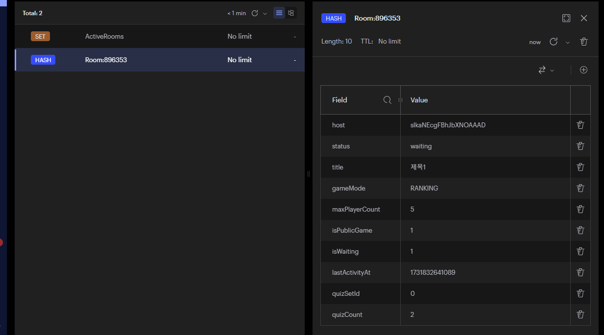 * - Room:{gameId} : 게임 방 정보를 저장하는 해시
