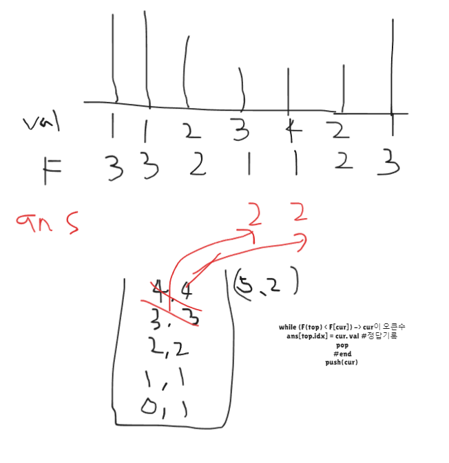 - F[cur]이 F[top]보다 더큰경우 -> cur이 오큰수임, 기록, pop, 반복
