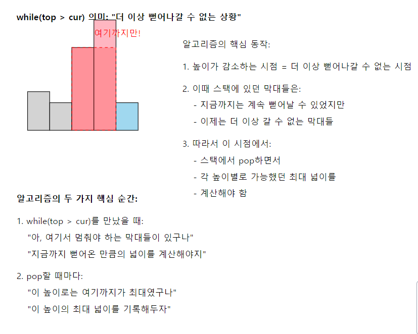 - while(top > cur) -> 뻗어나갈수없음, 하나씩 pop 해보면서 뻗어나갈수 있었던 넓이들을 계산해야함!