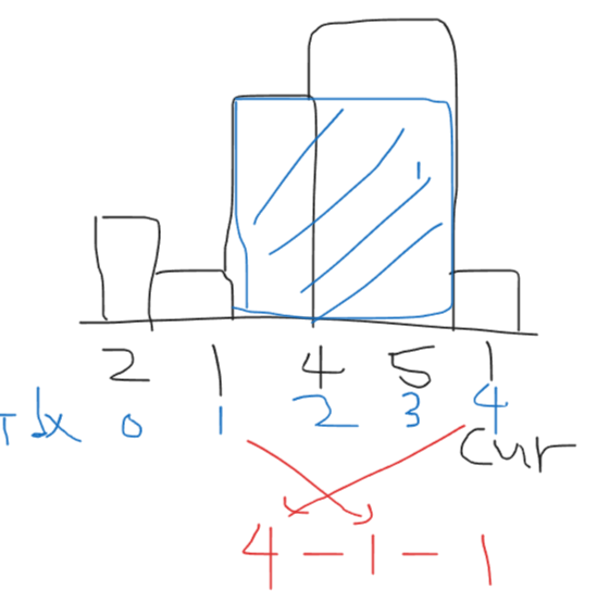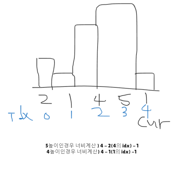 - 즉, cur이 top보다 작은경우 -> 좌측으로 높이하나씩 탐색 -> 확장될수있었던 넓이들을 전부 계산 하면된다!