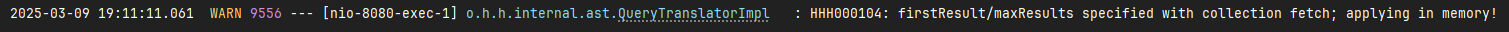 2025-03-09 19:11:11.061 WARN 9556 --- [nio-8080-exec-1] o.h.h.internal.ast.QueryTranslatorImpl : HHH000104: firstResult/maxResults specified with collection fetch; applying in memory!