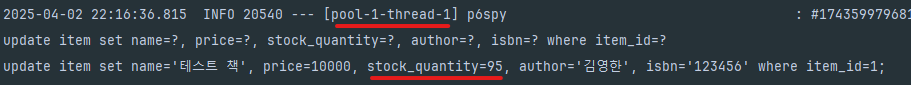 thread-1과 thread-2번에서 재고를 95라는 같은 값으로 update하고 있습니다.