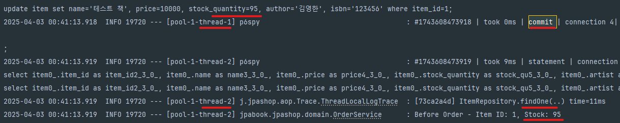 로그를 보면, 스레드 1번이 커밋된 후에야, 스레드2번이 ItemRepository의 findOne을 호출할수 있음을 볼수 있습니다.