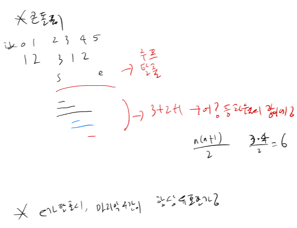 따라서 e가 n에 도달했을 때의 마지막 구간은 s부터 e-1까지 모든 숫자가 중복 없이 있는 상태입니다. 이런 상태에서 등차수열의 합 공식을 적용하면 그 구간에서 가능한 모든 연속 부분 수열의 개수를 정확히 계산할 수 있습니다.