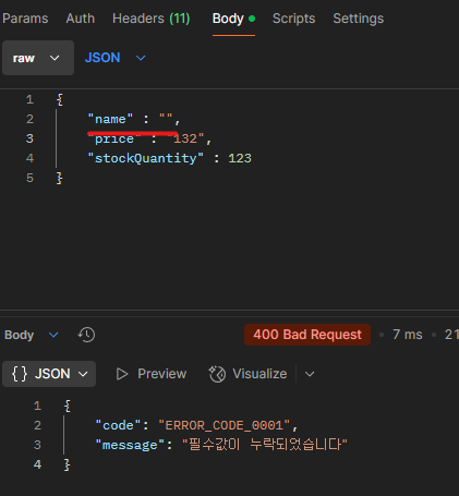 예외 예시는 아이템 등록시, 이름이 빈 경우 발생되는 MethodArgumentNotValidException인 경우로 보겠습니다.